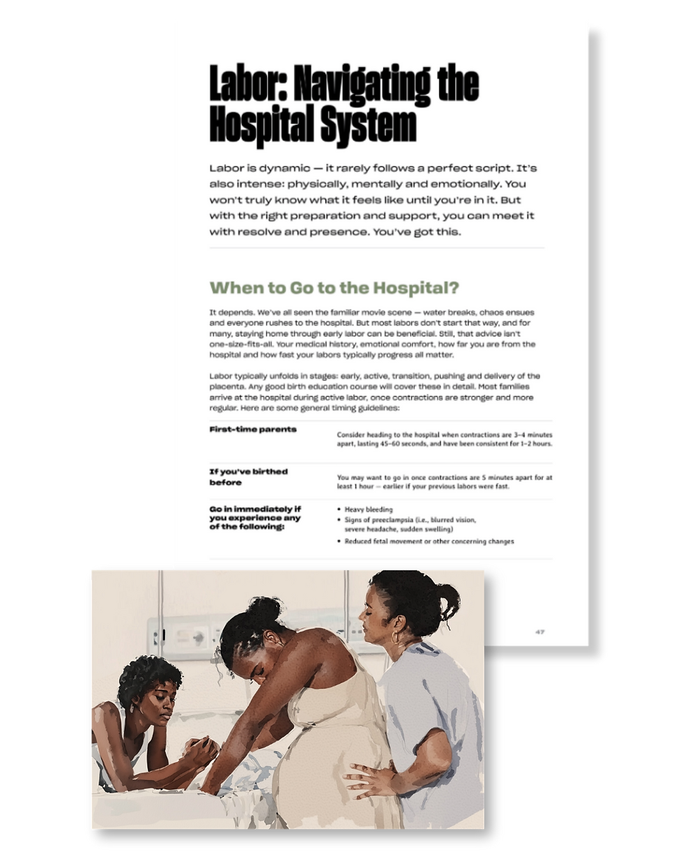 The United States has the highest maternal mortality rate of any high-income country and Black women are 3 to 5 times more likely to die from pregnancy-related causes compared to white women. About 98% of births in the U.S. take place in a hospital, and it is common for mothers to go into labor feeling unprepared to navigate the hospital birth setting. This guide offers a supportive framework for hospital birth, with information and tips to help Black moms feel as prepared as possible to have the birth experience they deserve. Covering topics such as Clarifying Your Birth Vision, Strengthening Your Autonomy, Building Your Birth Team, Navigating Labor, and Protecting Your Postpartum Recovery, we believe this guide will serve as a life-saving resource.