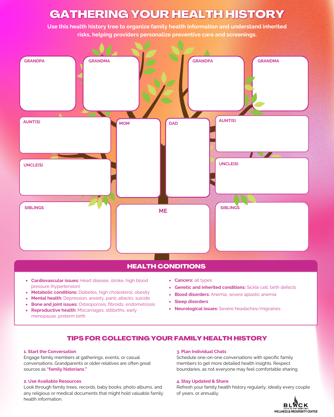 Use this health history tree to organize family health information and understand inherited risks, helping providers personalize preventive care and screenings.